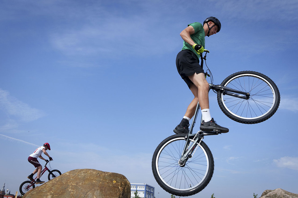Under Europæisk Gadefest vil trialatleter vise publikum eksempler på deres imponerende evner på de saddelløse mountainbikes.