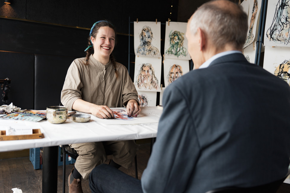 Kunstner Iris Bakker tegner portrætter af gæsterne, uden at se på papiret. Hun ser kun på personen foran hende, mens hun med begge hænder tegner hurtige og udtryksfulde portrætter. Det er et øjebliks nærvær, foreviget på papir.