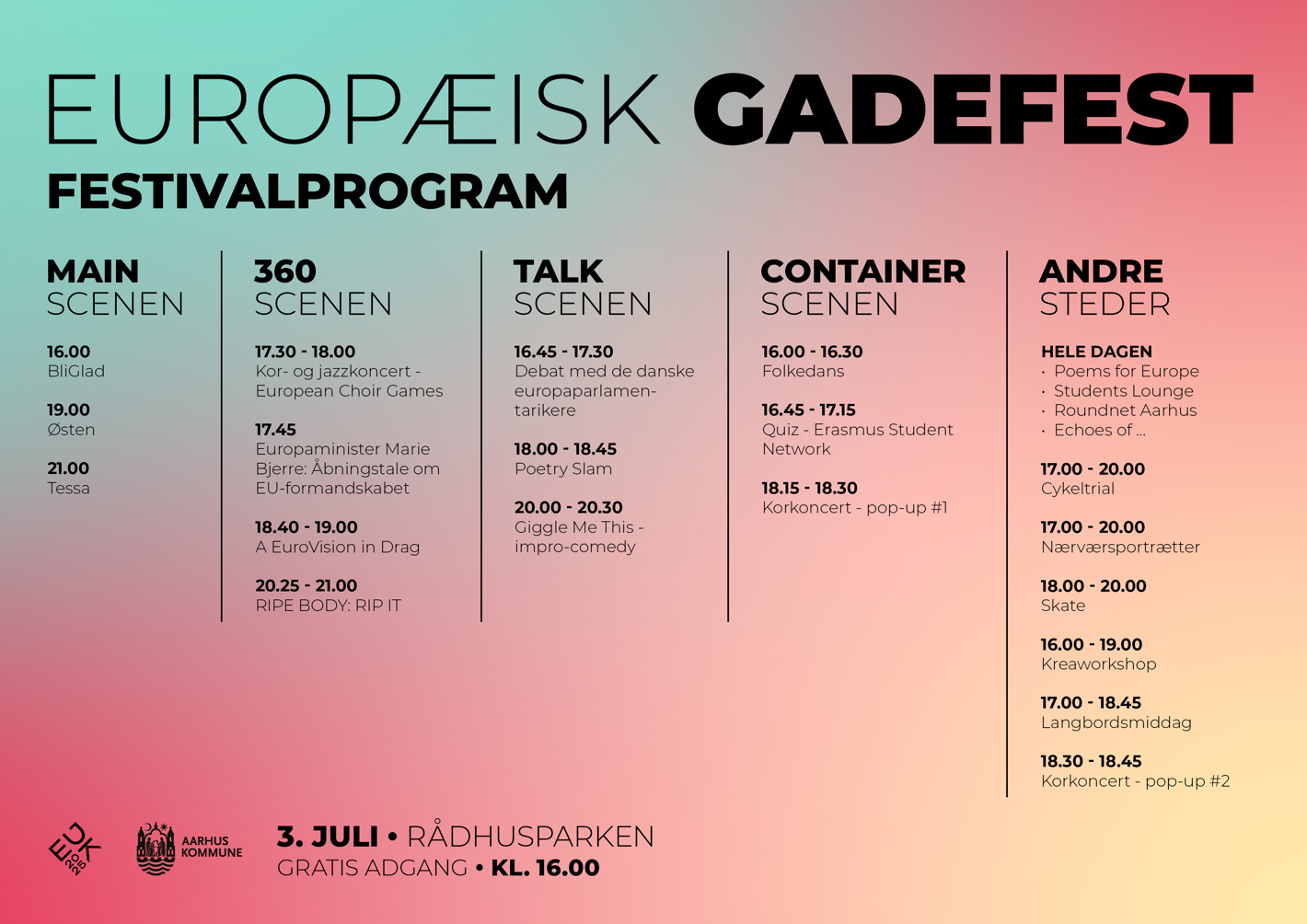 Aarhus danner ramme om en offentlig markering af Danmarks overtagelse af EU-formandskabet. I Rådhusparken vil der være åbent for alle interesserede til Europæisk Gadefest.
